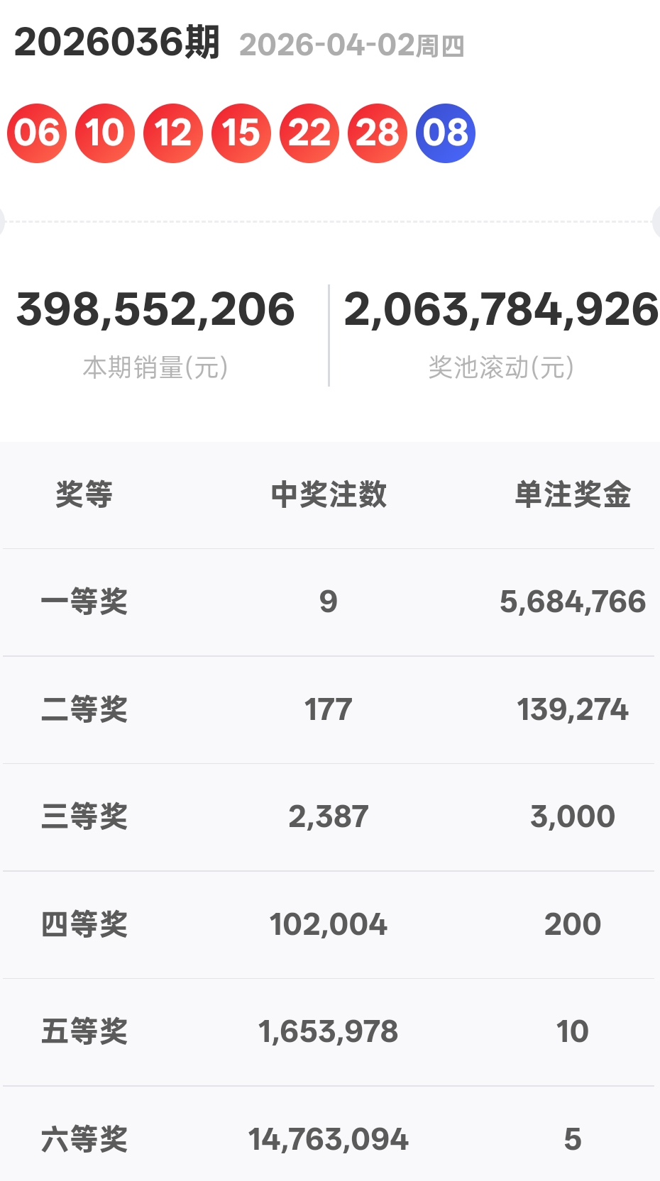 中福小双双2026036期开奖结果