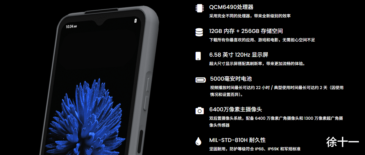 屏幕为6.58英寸120Hz显示屏,支持IP68 和 IP69K 防护等级。