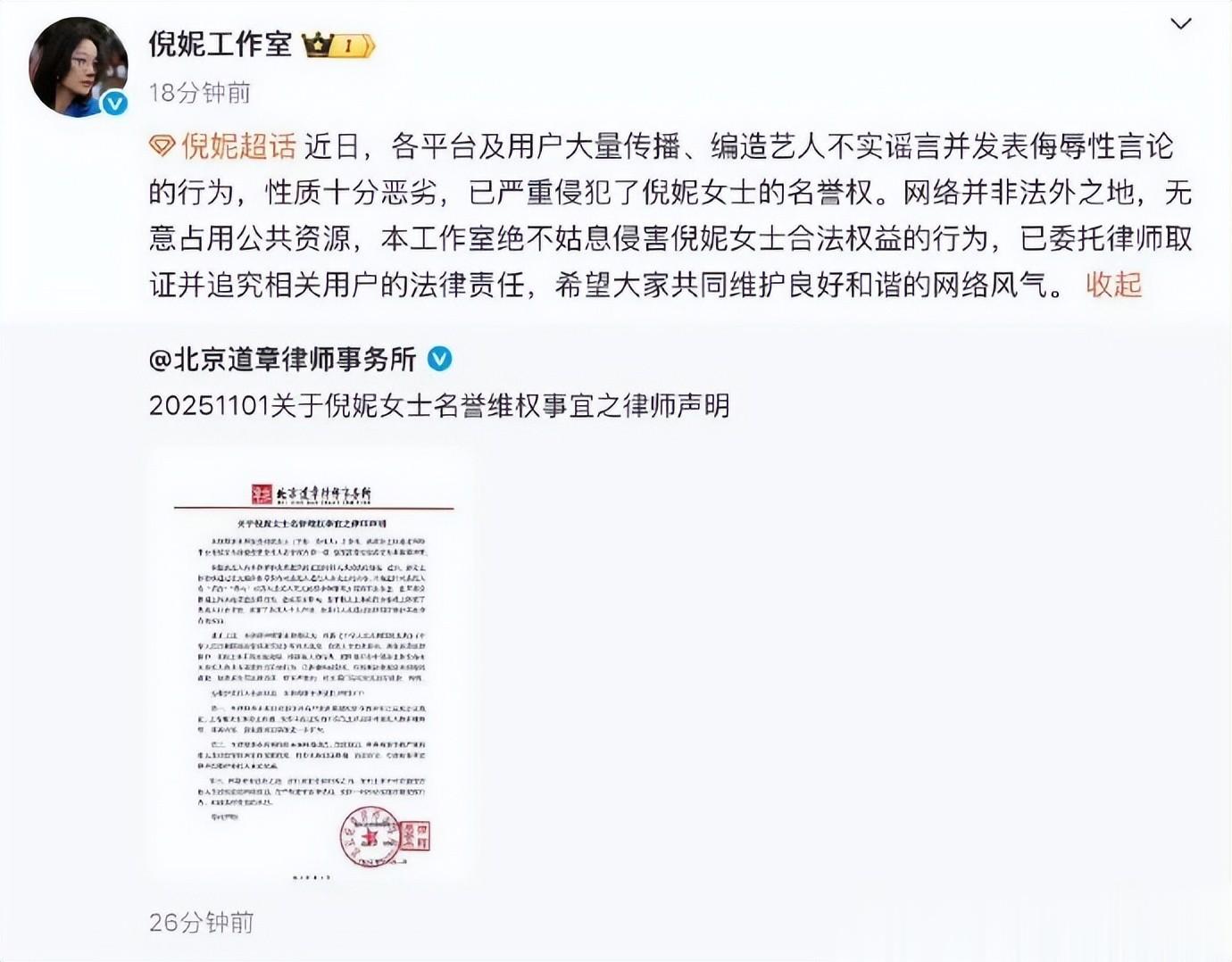 随着这些事件被扒出,倪妮的口碑一落千丈,工作室随后发了维权声明,大意是说这些都是伪造了,侵犯了倪妮的名誉权,之后将会采取法律行动。