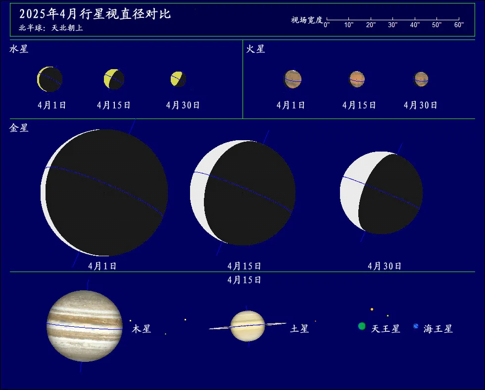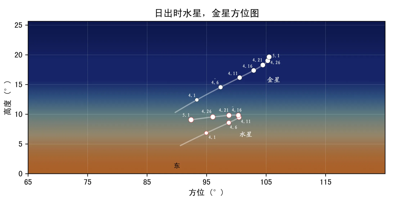 从3月下旬开始,金星来到凌晨的东方天空,高度逐渐升高,4月里,金星从日出时的10°升高到20°,观测条件越来越好,并在27日前后迎来亮度的极值,达到-4.8等,日出时地平高度约19°,此后金星将继续升高,但亮度则慢慢降低。