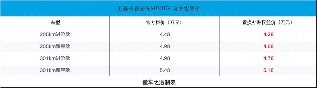 【懂车之道 产品】近日,懂车之道获悉,上汽通用第五代宏光MINIEV正式发布上市,共推出4款车型,官方售价区间为4.48-5.48万元,置换补贴价为4.28-5.18万元。本次上市车型均为四门四座版本,可选205km和301km两种CLTC续航里程。下面,和大家一起来看看新车的产品力如何?