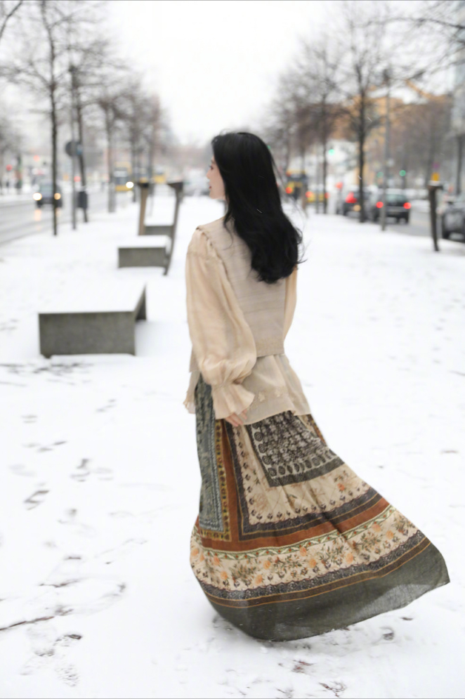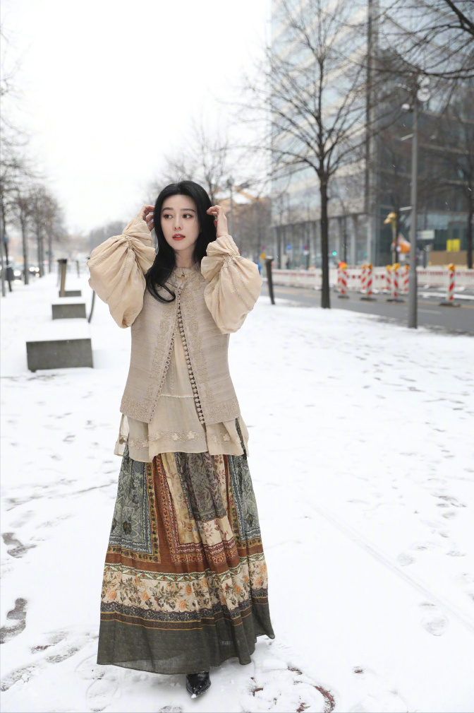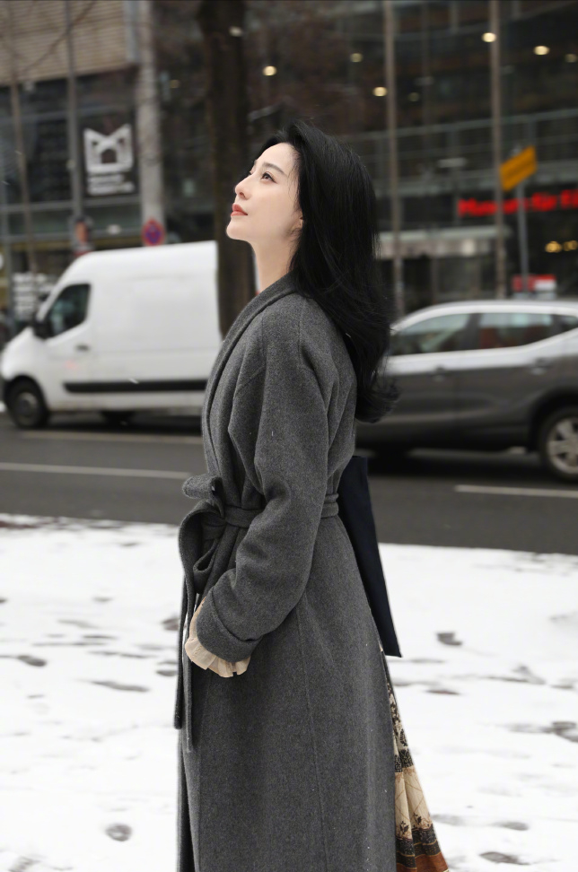 在柏林的大街上,范冰冰穿着一件灰色的大衣,背对着雪花,眼神轻轻仰望着天空。尽管寒冷的空气在四周弥漫,但她的神态却显得异常从容,仿佛整个世界在她眼前变得柔和。她的灰色大衣让她在人群中异常引人注目,而微微扬起的脸庞则更添一丝沉静与优雅,仿佛她的心也随着飘舞的雪花缓缓升腾。