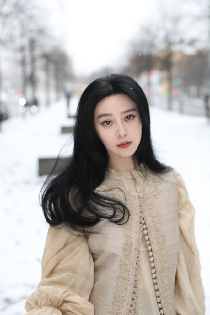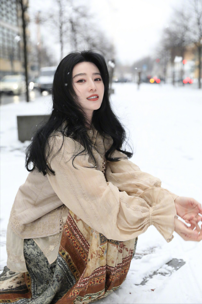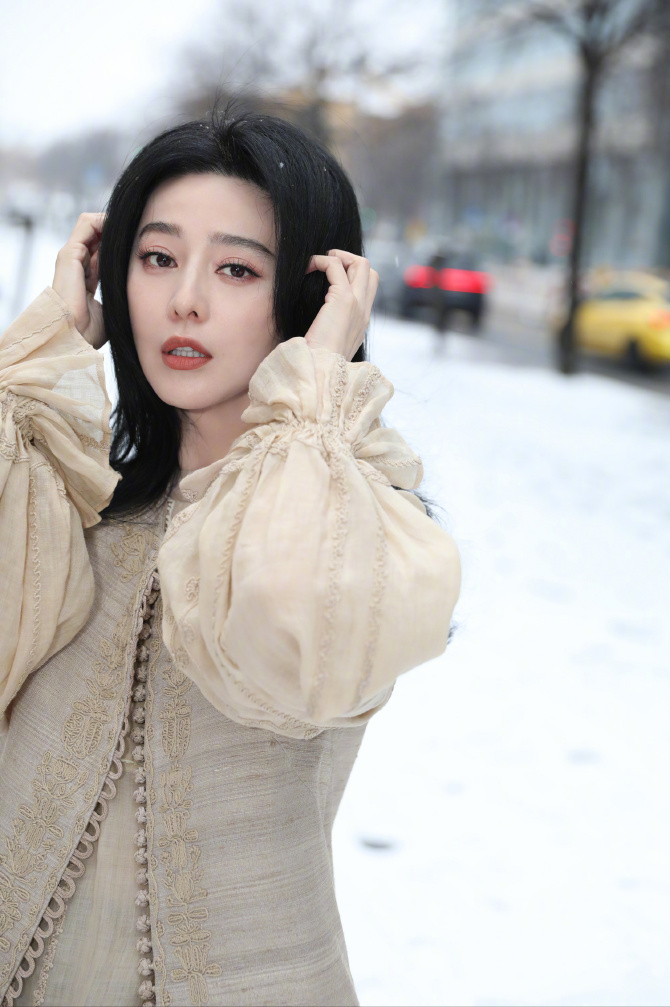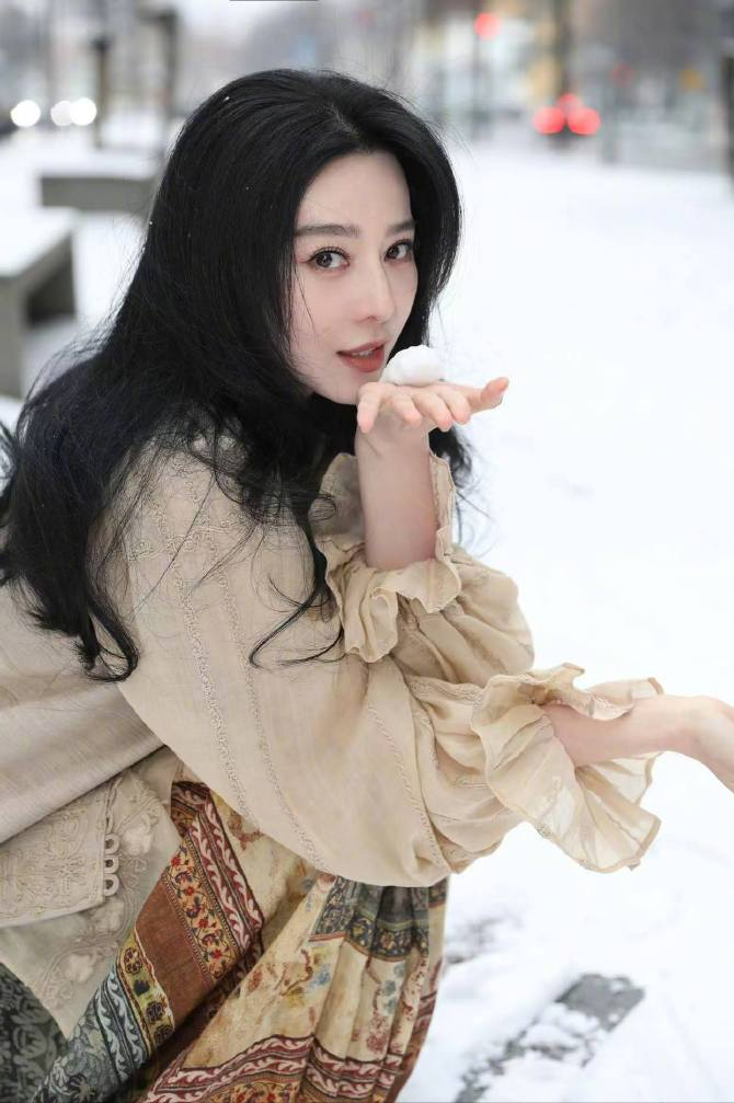 范冰冰的动作显得格外温柔,脸上的微笑也透露出一种难以言喻的温暖和柔情。她仿佛在享受这片雪花的触感,而她的眼神则锁定在那只雪花上,仿佛在诉说着关于浪漫和期待的故事。整个画面极具诗意,温暖的笑容与飘雪的景象形成鲜明的对比,让人感受到一种宁静又甜美的氛围。