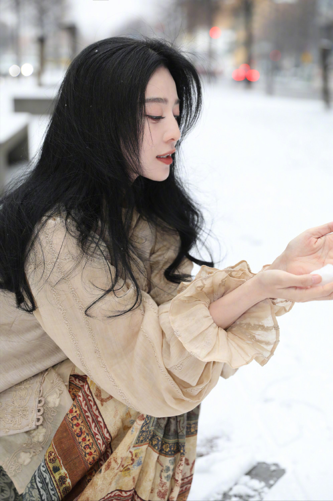 她手中捧着雪花,神情轻松,微微低头,嘴角挂着温暖的笑意,仿佛在享受着这一刻的宁静。她的笑容温柔却充满力量,仿佛每一片飘落的雪花都带着她的祝福和期待。这个瞬间,她不再是娱乐圈的明星,而是那个在寒冷的雪地里展现出温暖与坚韧的女人。