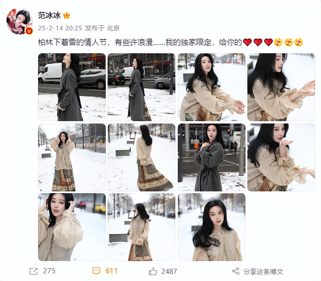 在这个充满浪漫气息的情人节,范冰冰选择了在冰雪覆盖的柏林度过这一天,虽然她没有与任何人共度时光,但她独自一人的身影依旧展现出强大的魅力。她的每一张照片都让人感受到冬日的温暖与她本身的独特气质,依旧是那个不受时间和风雪影响的范冰冰,永远自信、美丽。