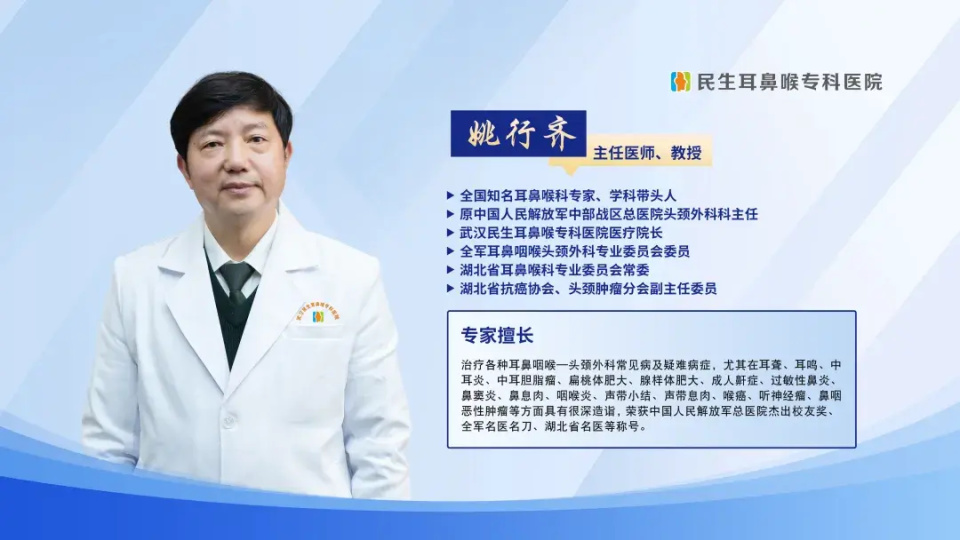 原广州军区武汉总医院头颈外科主任、现任武汉民生耳鼻喉专科医院医疗院长,师从于世界著名耳鼻喉专家姜泗长院士。