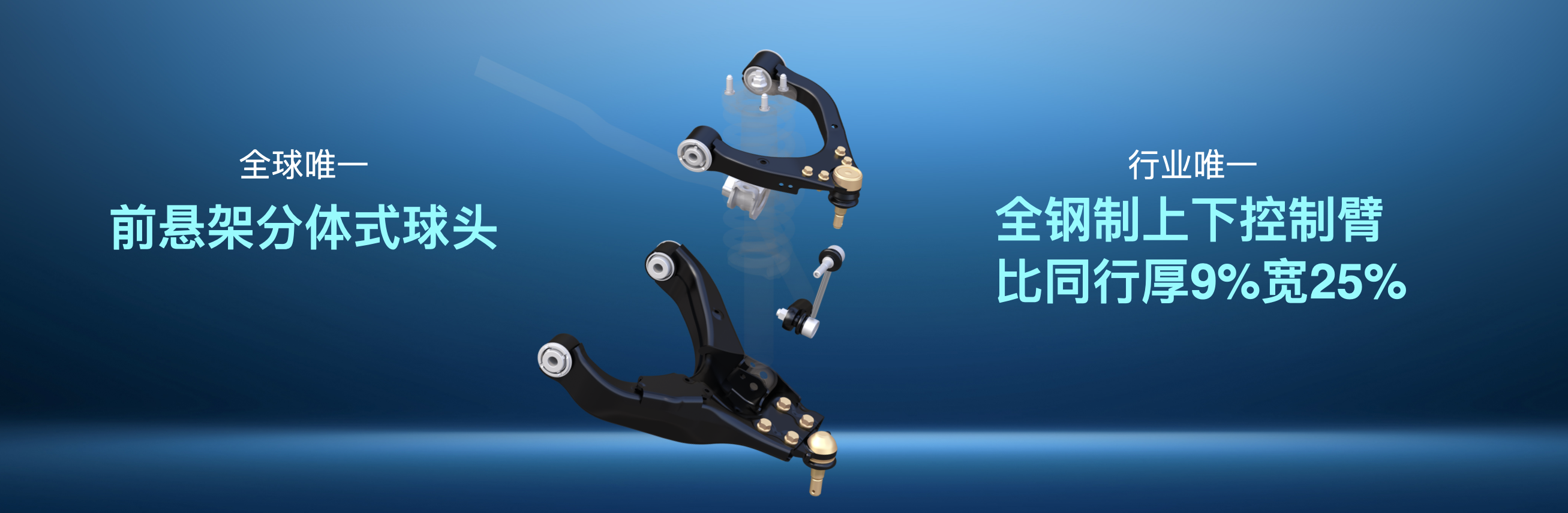 底盘的考验不仅限于极端场景,更体现在日复一日的高频使用中。除了颠不坏,更要用得久。悍盾底盘前悬架采用分体式球头设计,球头螺栓均带防脱销,确保螺母永不脱落。同时配备全球唯一的全钢制上下控制臂,下控制臂比同级厚9%、宽25%,抗造能力直接拉满。