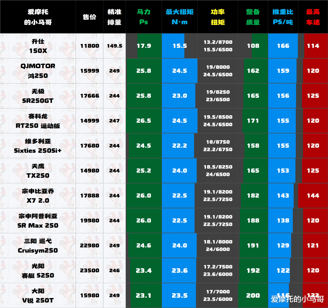 虽然最大马力确实比不过250cc的车型,但凭借轻了近一半的整备质量,最终推重比,升仕150X居然能在账面数据层面碾压所有热门250踏板!