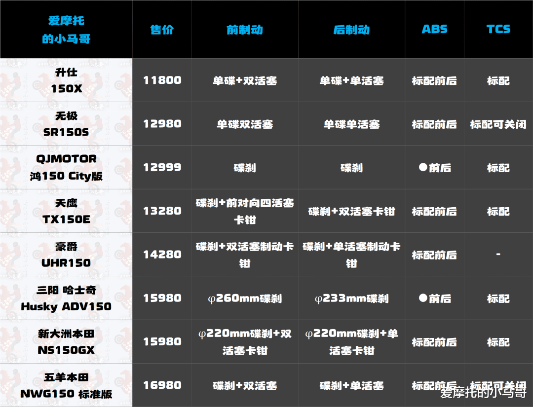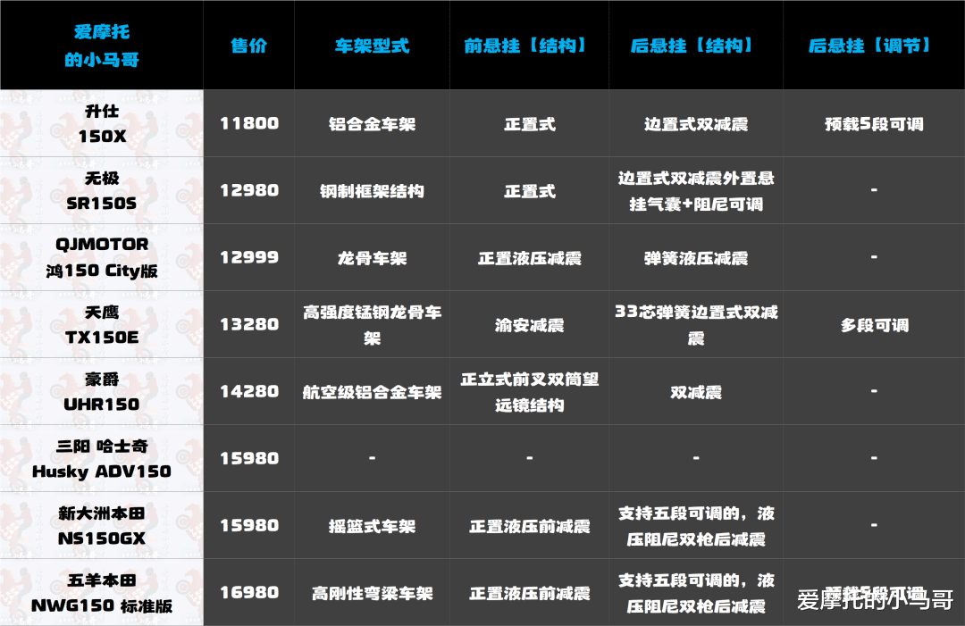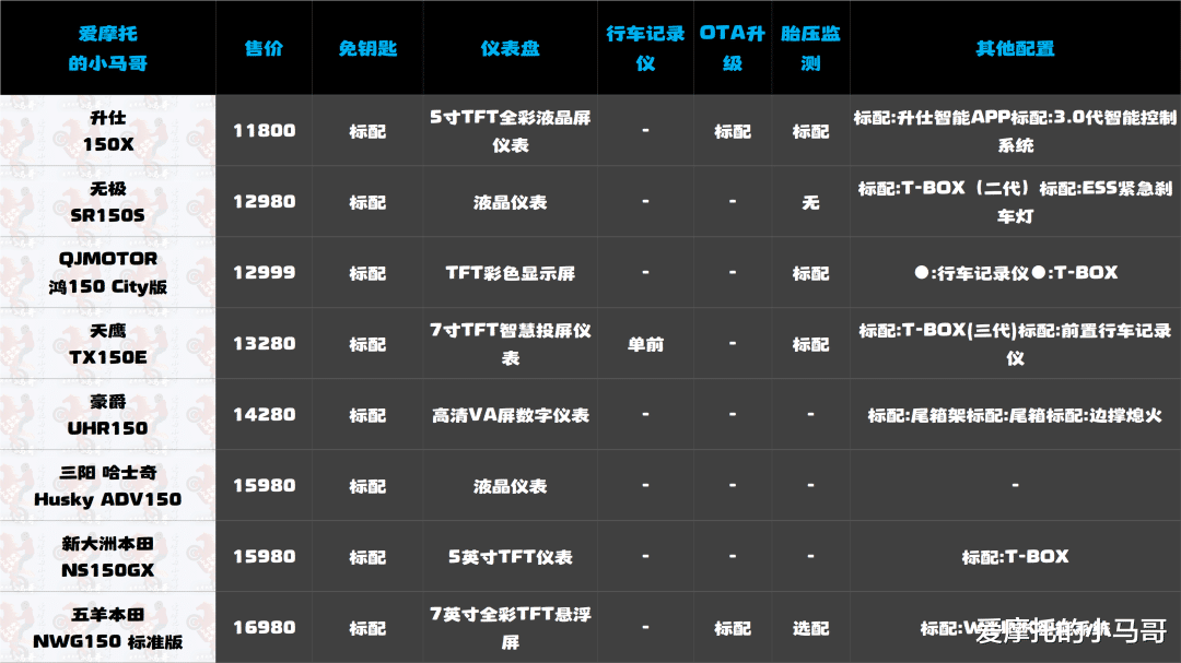 当然配置层面升仕150X肯定给的很全面,但其实上面这组车型里面,那些售价7000+的版本,他们的配置其实也挺全的,并不比升仕150X逊色多少,这个后文我会用配置清单对比来说明。