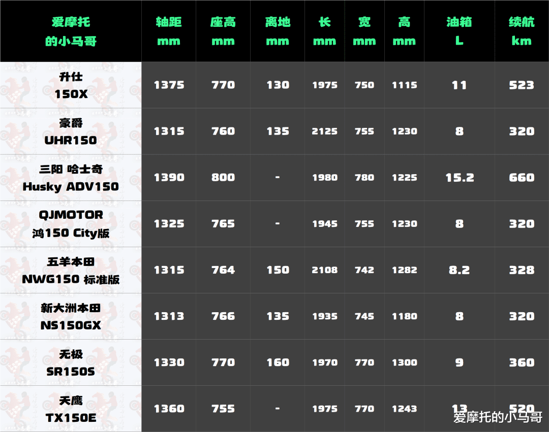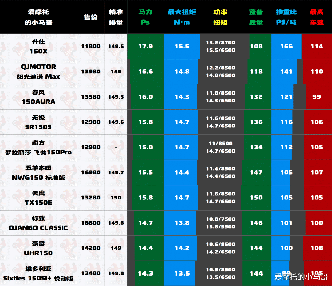 抛开价格,升仕最厉害的其实是它的账面数据!具体有多厉害?先看看它跟同级别的其他主流150cc的踏板比一下就知道了。