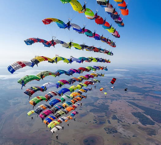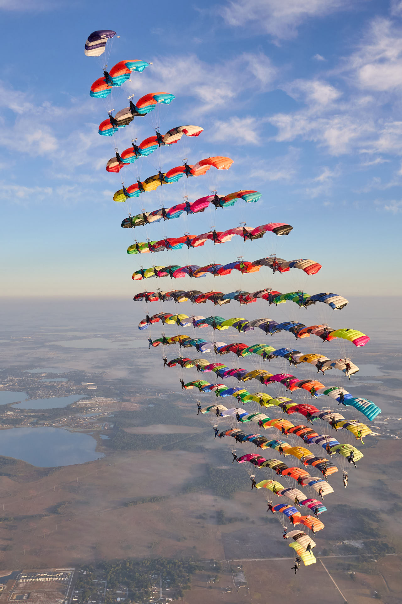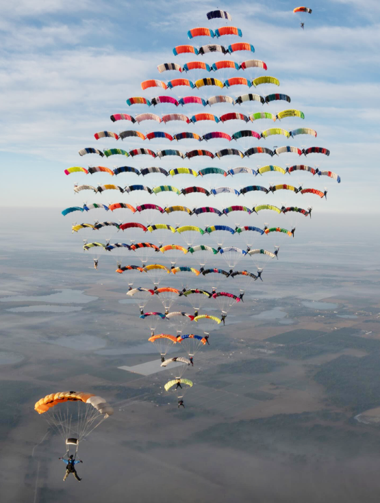 11月22日,美国佛罗里达州的莱克威尔斯上空,104名来自全球20个国家的跳伞运动员完成了一次史诗级挑战——在空中拼出一