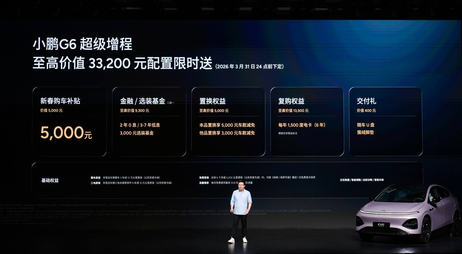 【英俊的车车报道】今日,小鹏汽车举行小鹏G6超级增程上市发布会,新车定位六项全能AI增程SUV,以“六项全能 一步到位”为核心,凭借同级综合续航第一、同级补能速度第一、同级车端有效算力第一、同级最强底盘系统、同级最强主动安全和同级得房率第一的六大核心优势,打造真正满足用户全场景需求的国民车。本次发布小鹏G6超级增程1704 Max,官方指导价为18.68万元,用户可选装两个智能升级包,加购12,000元升级为Ultra SE版本、加购20,000元升级为Ultra版本。即日起至2026年3月31日24点前下定小鹏G6超级增程,可享至高价值33,200元限时权益礼包,包括5,000元新春购车补贴、至高价值9,300元金融/选装基金(二选一)、至高价值5,000元置换权益、至高价值13,500元复购权益和价值400元交付礼。
