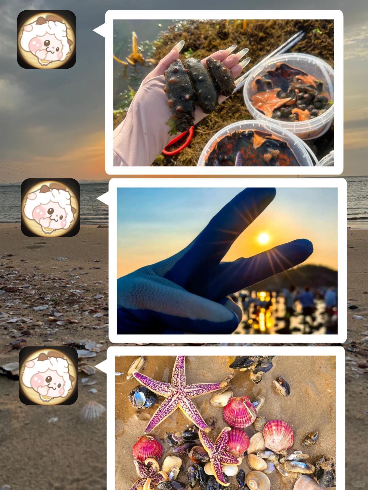 捡了带细花纹的粉贝壳(揣回去当书签)📖,还摸了只比之前大的黑海星,拍了两张照存相册📸。