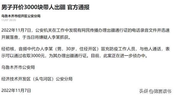 防疫人员的兄弟都能私用权利,这种事大家如何能忍!不过,大家先别着急上火,很快,官方回复就来了。就在当天,乌鲁木齐市经开区公安分局发布了警情通报称:公安机关在工作中发现有网民传播办理出疆通行证的电话录音文件并迅速开展落查,于当日将嫌疑人李某抓获。经初核,音频中代办人李某(男,30岁,住经开区)冒充防疫工作人员,与他人通话,表示可以通过收取3000元,为其办理出疆通行证。目前,此案正在进一步侦办中。