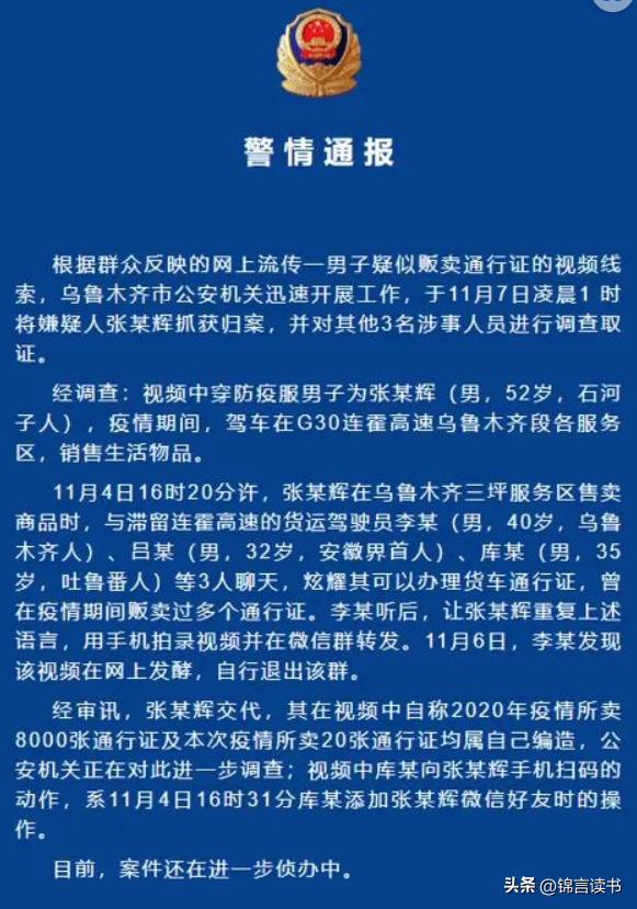 11月7日,乌鲁木齐市公安局又通报一起驾车在G30连霍高速乌鲁木齐段售卖商品的张某辉炫耀其“2020年期间共售卖了8000张通行证以及本轮疫情共售卖20张通行证的”案件!