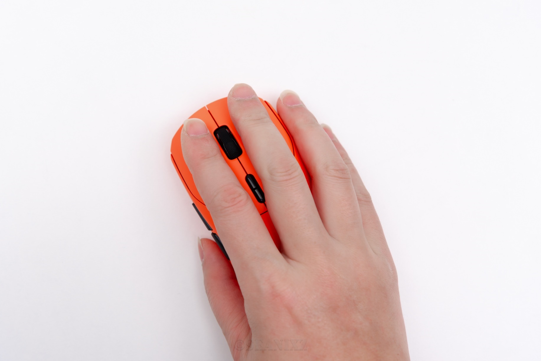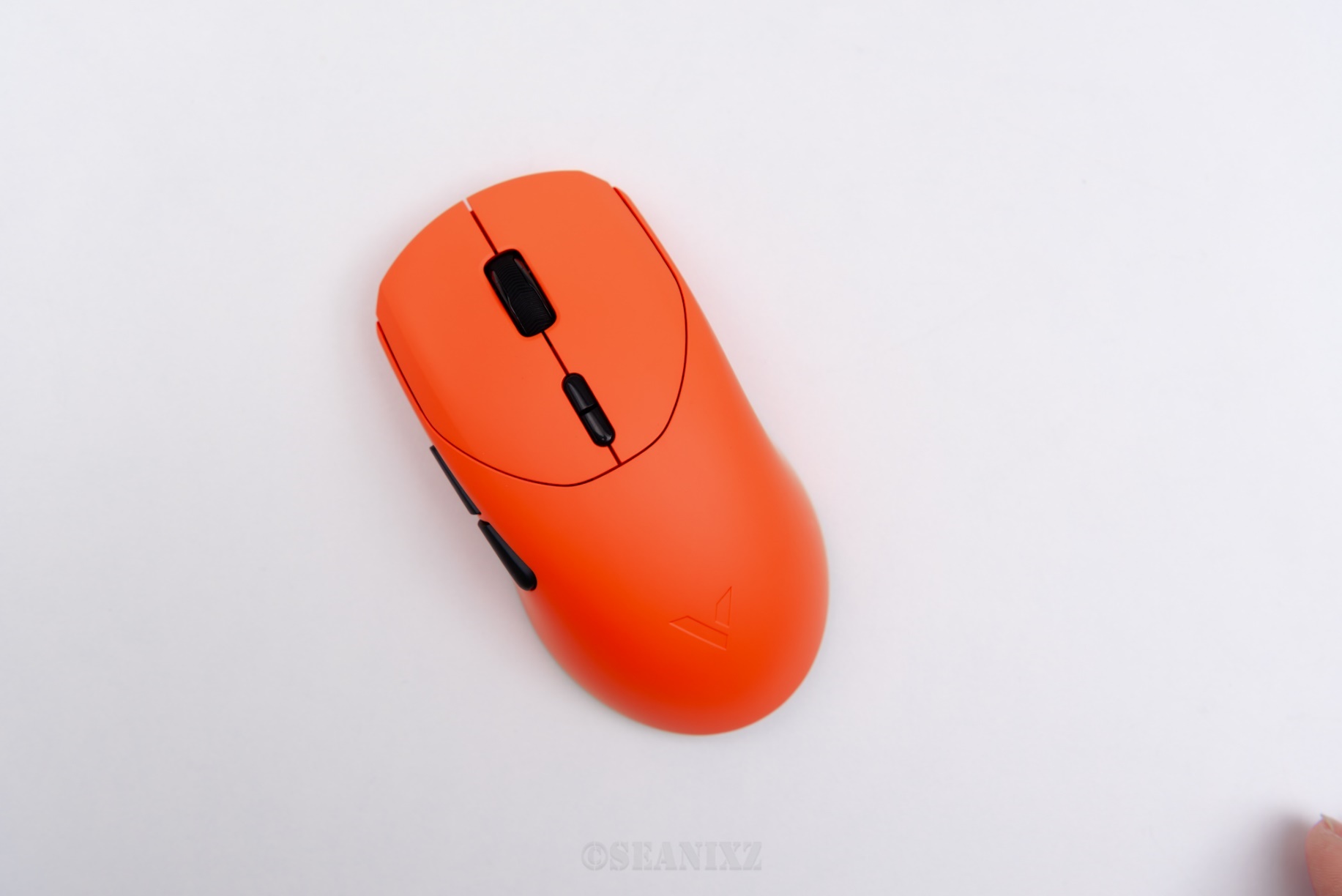VT9 焰影橙鼠标表面采用了亲肤防滑涂层,触感温润细腻,汗手玩家也能牢牢掌控。尺寸为125×65×39mm,属于典型的中大手模具,官方推荐手长17.5-19cm的用户使用。