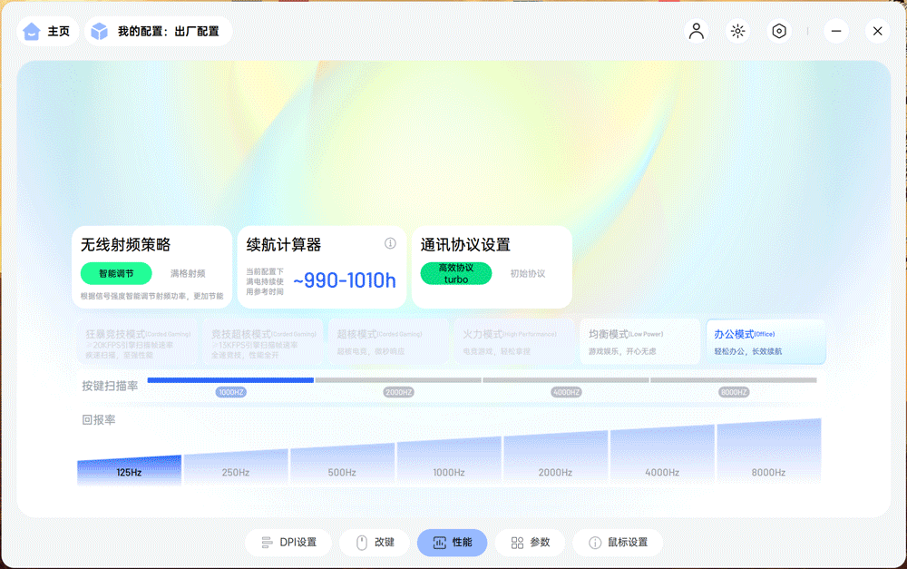 RGB灯效是P5 PLUS的另一大亮点。底座腰线设计有RGB灯带,内置6种幻彩灯效(呼吸、循环、常亮等),且已接入A hub全家桶生态,灯光亮度和速度可通过雷柏驱动调节,支持1680万色自定义。对于桌搭爱好者来说,这无疑增加了桌面的氛围感。