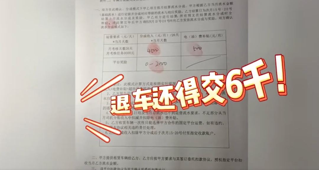 跑车赚不到钱,不跑更麻烦,公司告知他,两天不出车不报备会拖车,拖车费由他承担;连续三天日流水达不到300元,不仅拖车,还要交6000元违约金。直到这时,张师傅才仔细查看合同,发现里面还藏着4000元履约风险保证金,提前解约更是要被扣6000元违约金。