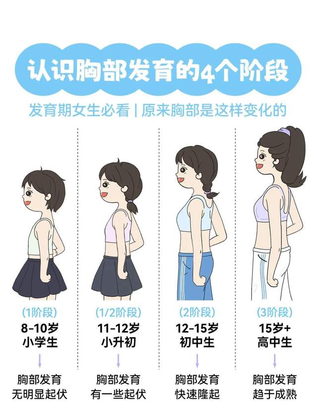 从乳房出现硬块,身高快速增长,到出现腋毛,再到初潮,整个阶段大概要持续3-4年的时间,而一旦例假规律,就意味着女孩的发育已到尾声,身高也即将停止生长。