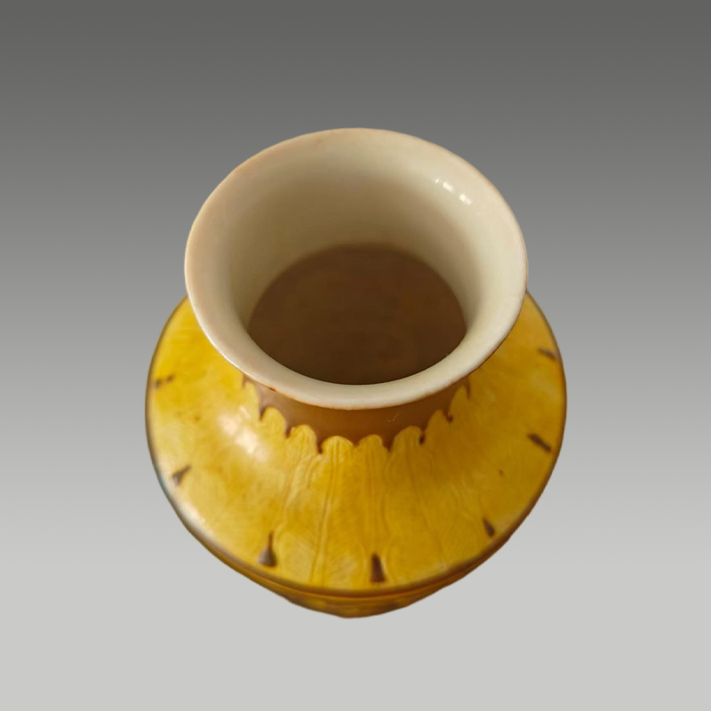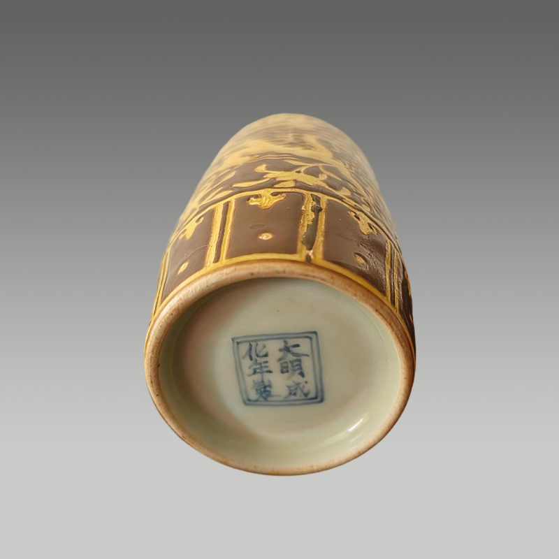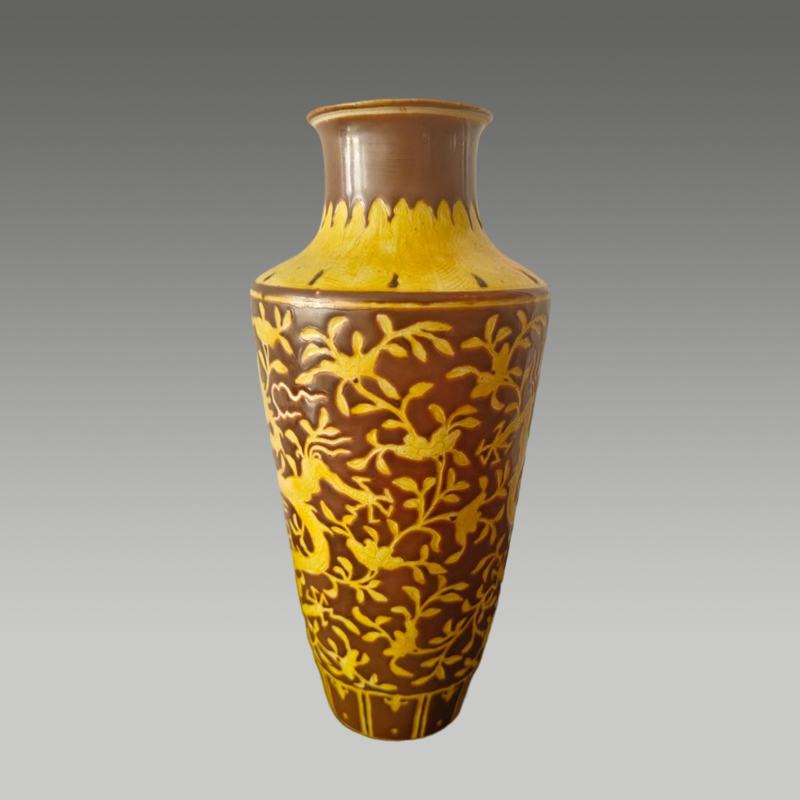 此瓶酱地黄釉交相辉映,金龙穿花腾跃,鳞爪分明,纹饰繁丽工致。胎釉莹润,款识规整,尽显雍容气度与匠师巧思