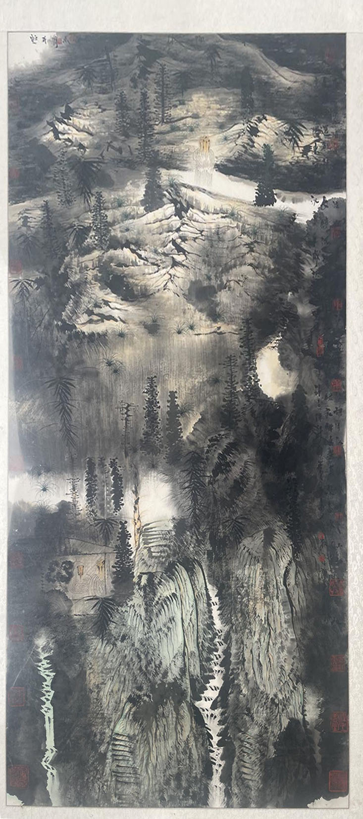 这幅山水画作笔墨苍劲,墨色淋漓,山势巍峨,飞瀑流泉与茂林相映,意境雄浑深远
