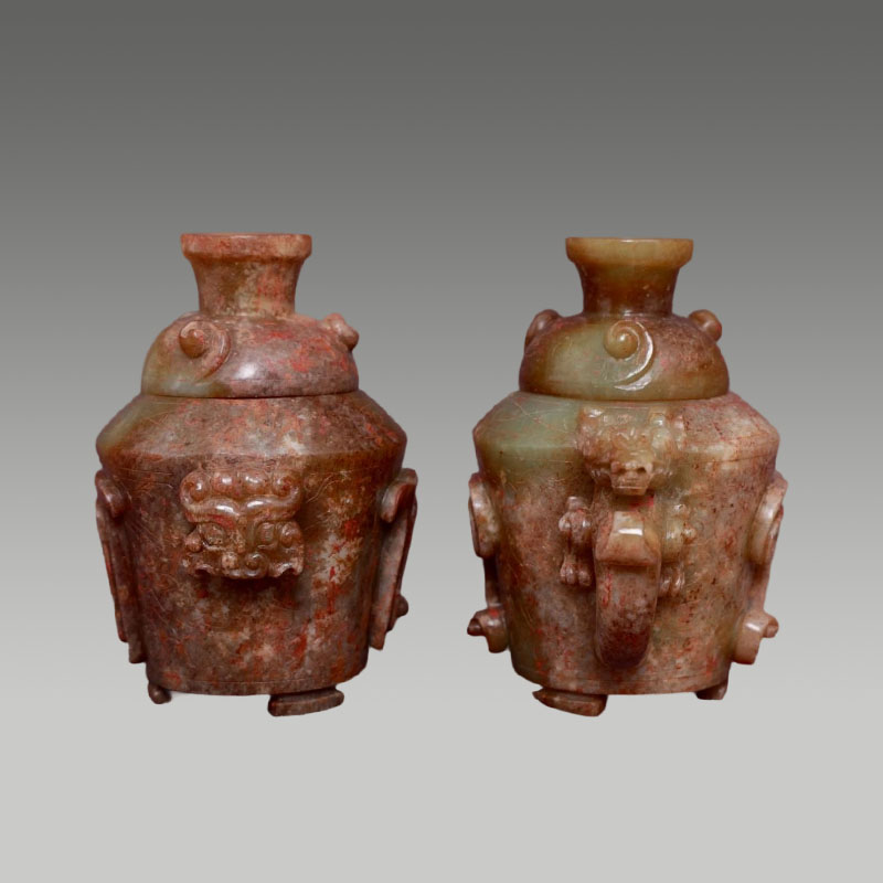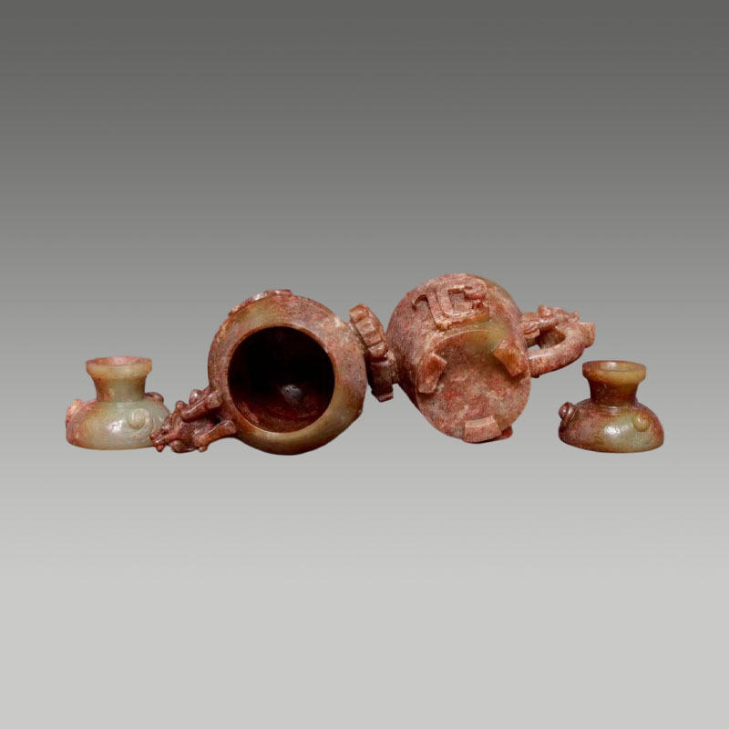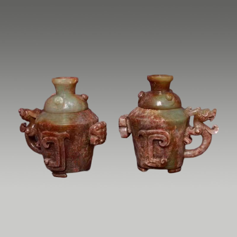 这对和田玉龙首卮尽显龙之威严,雕工精湛传神,浮雕纹路细腻生动,器型饱满雅致,红褐沁色添古朴意蕴