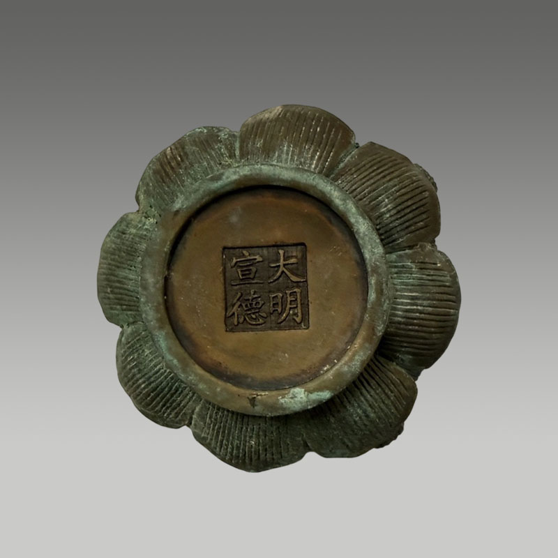 这尊铜炉造型精巧,莲瓣纹与镂空雕饰相映成趣,铜色温润,古韵悠然,置于案头,尽显雅致与匠心