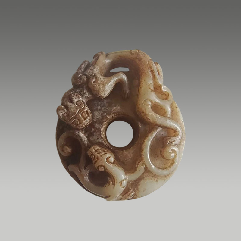 此玉璧质地温润,包浆古雅。正面高浮雕螭龙盘绕,身姿矫健灵动,线条婉转流畅;背面谷纹排布规整,朴拙中见精巧