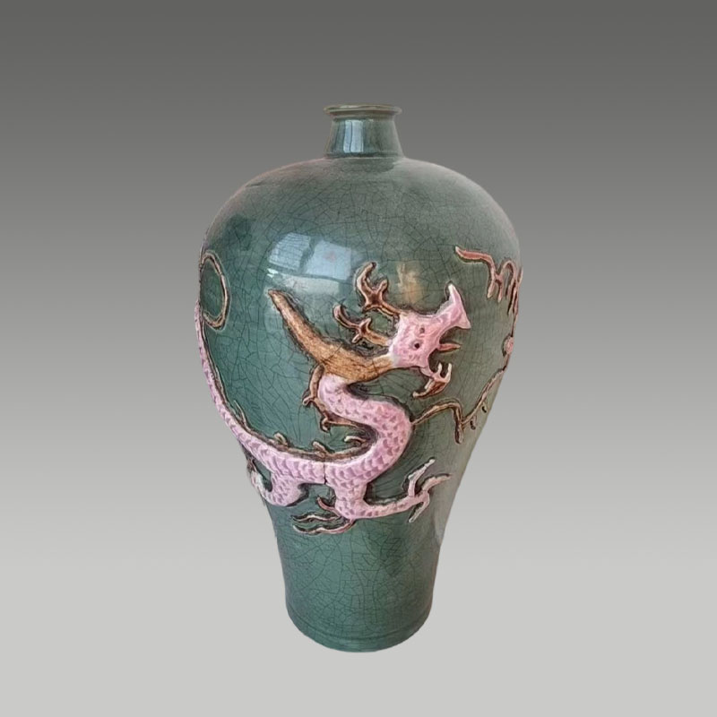 冰裂纹肌理细腻雅致,粉龙浮雕矫健灵动,色彩对比鲜明,造型饱满大气,静立间尽显雄浑雅致的气韵