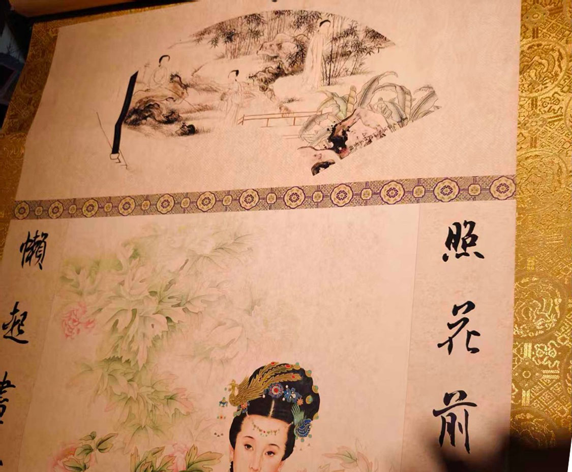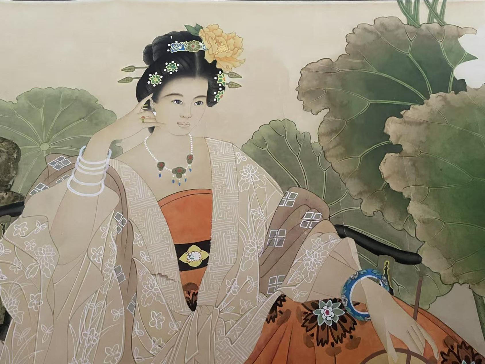 这幅仕女图笔墨细腻温婉,仕女眉眼含春,衣袂飘逸,衬着繁花翠叶,诗意盎然。