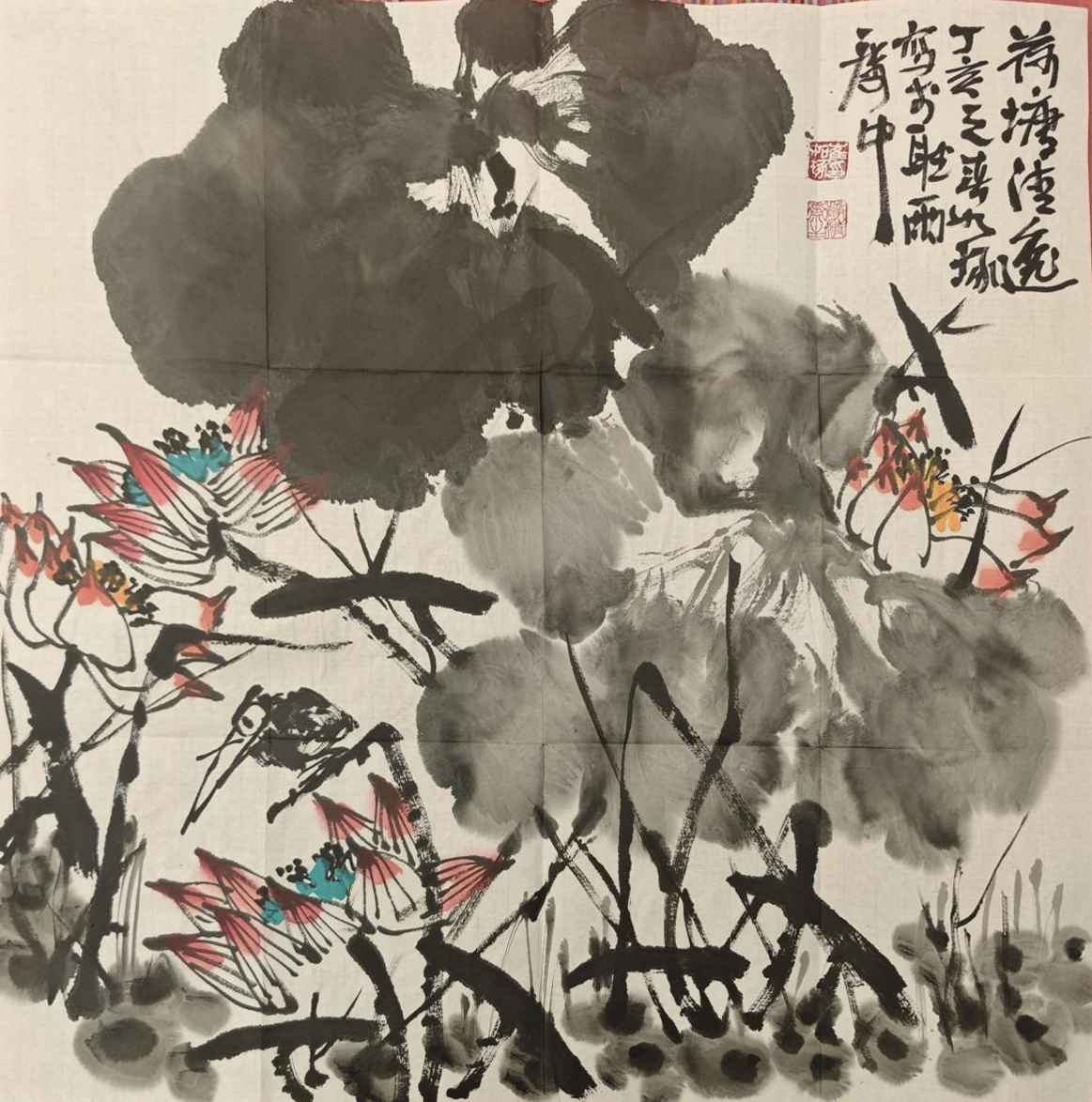 此作以淡墨写荷,粉瓣含娇,墨叶凝翠,线条清劲秀逸。题字行云流水,与画面相得益彰,尽显清雅脱俗之韵