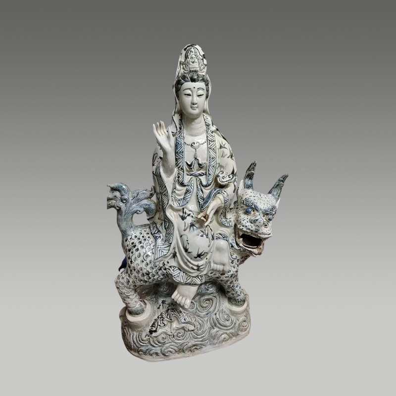 青花绘韵,法相慈悲。观音衣袂翩跹,麒麟昂首威灵,鳞羽纹饰纤毫毕现。整器气韵庄严