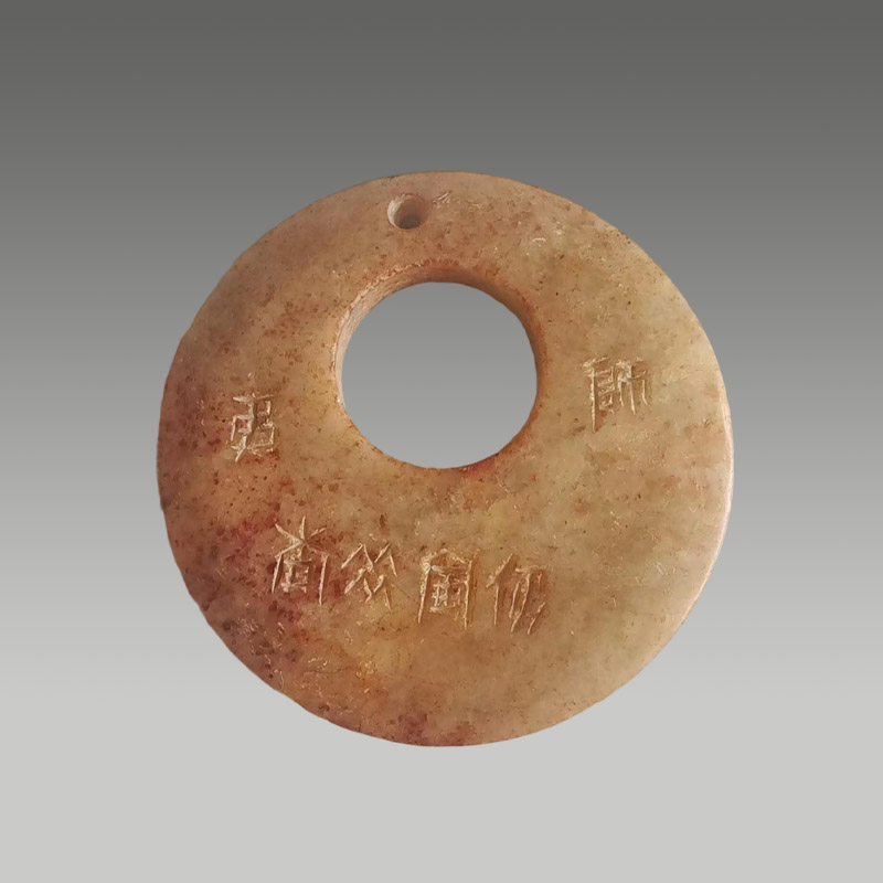 这枚玉璧质地温润凝脂,色泽古朴沉凝,红斑褐晕间尽显岁月沉淀。器表阴刻铭文线条古拙,笔力苍劲