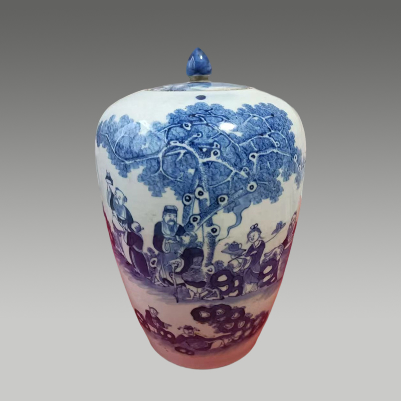 此青花盖罐釉色莹润,青花发色浓淡相宜,人物故事生动传神,构图层次分明,尽显雅致气韵与匠心巧思