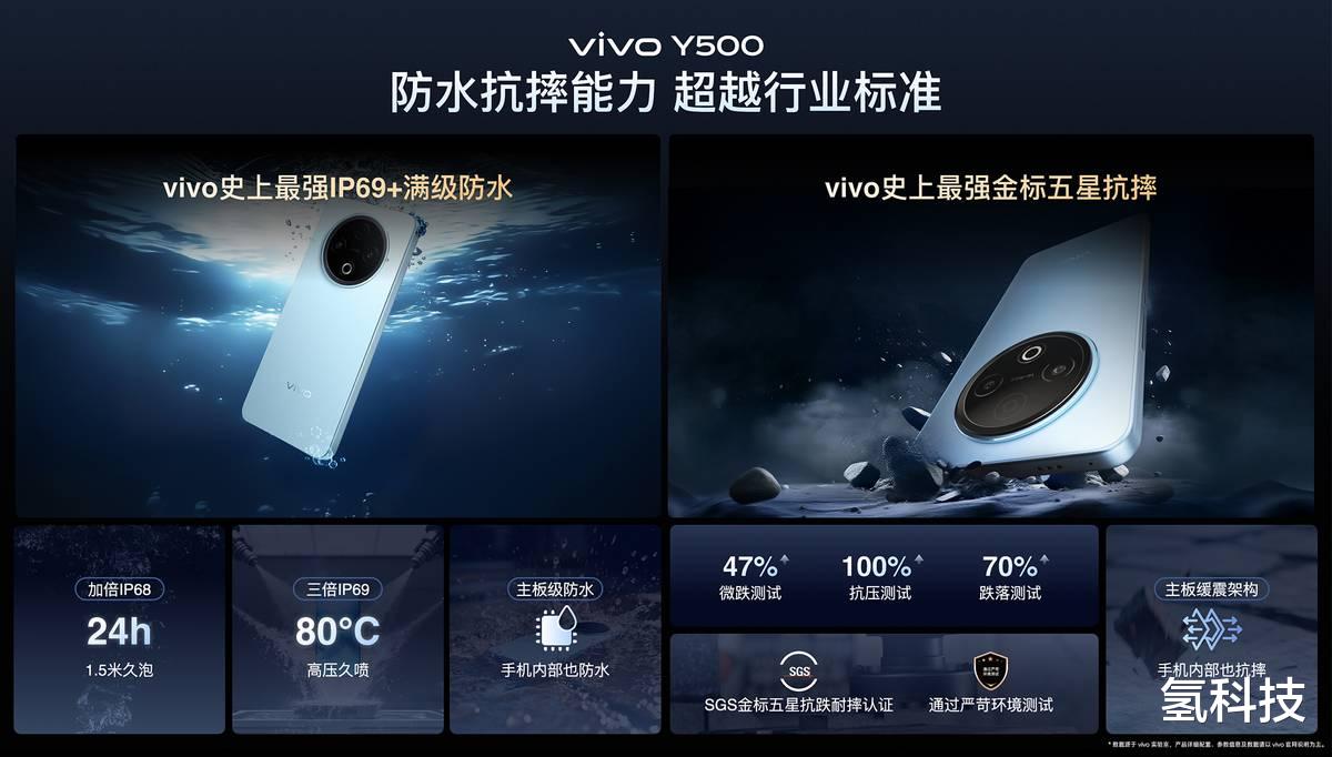 遇到雨天出门,手机的防水能力就很重要了。vivo Y500拥有IP68/69/69+满级防水能力,不仅能在1.5米深的水里浸泡24小时,还能扛住80度高温的喷水测试。雨天忘记带伞,手机被雨水淋到也不用怕;就算不小心把手机掉进了水槽,捞起来之后照样能正常使用。另外,它的金刚磐石架构还让手机通过了1.7米六面四角的花岗岩跌落测试,日常使用时从口袋或者桌面滑落,也能有效起到防摔的作用。