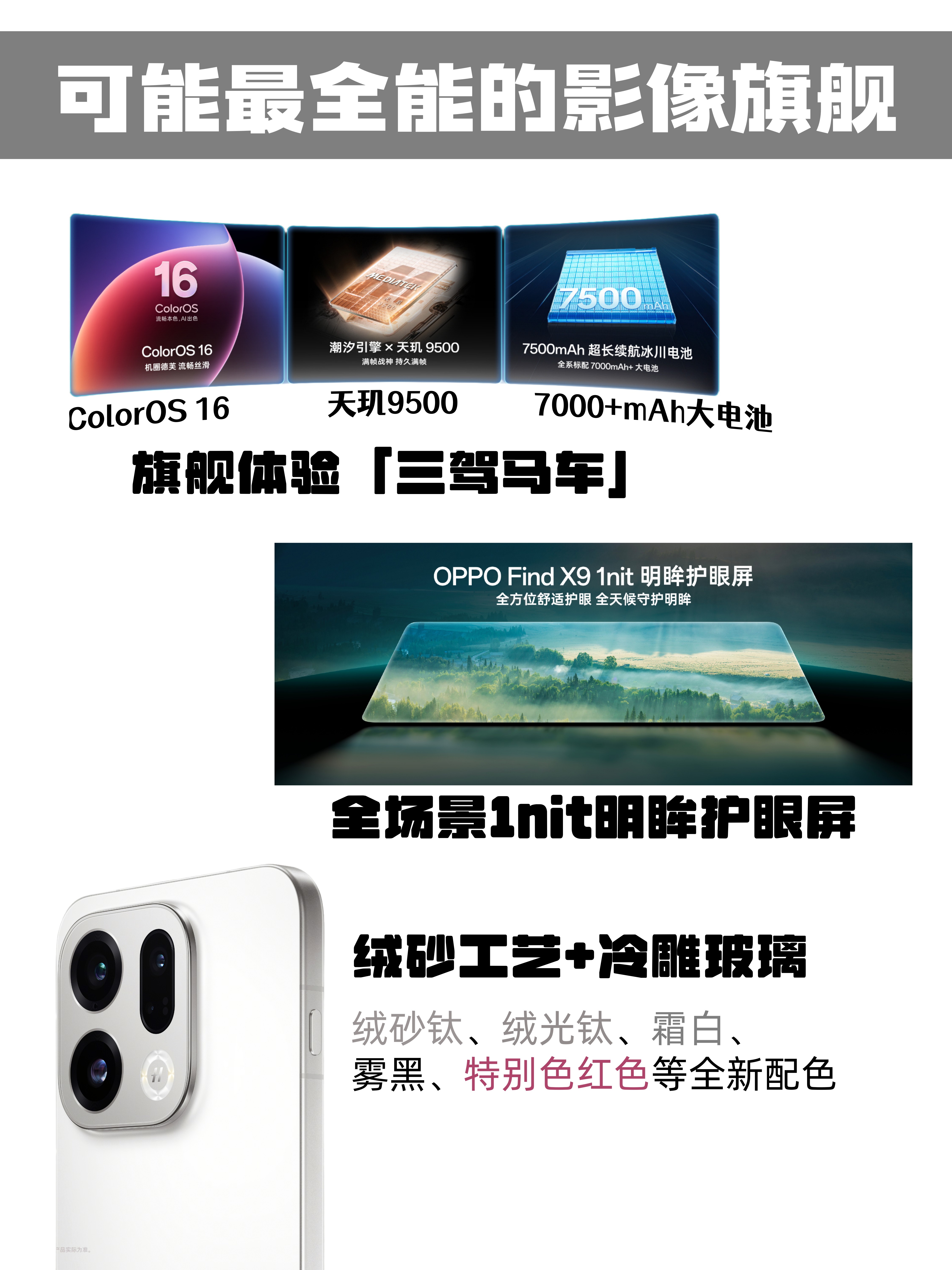 加上天玑9500旗舰芯、ColorOS 16x潮汐引擎、7025mAh超大电池组成的「三驾马车」,全场景1nit明眸护眼屏,绒砂工艺+冷雕玻璃后盖的高级质感,以上这些在OPPO Find X9上就已经全部标配,绝对称得上「最强标准版」!