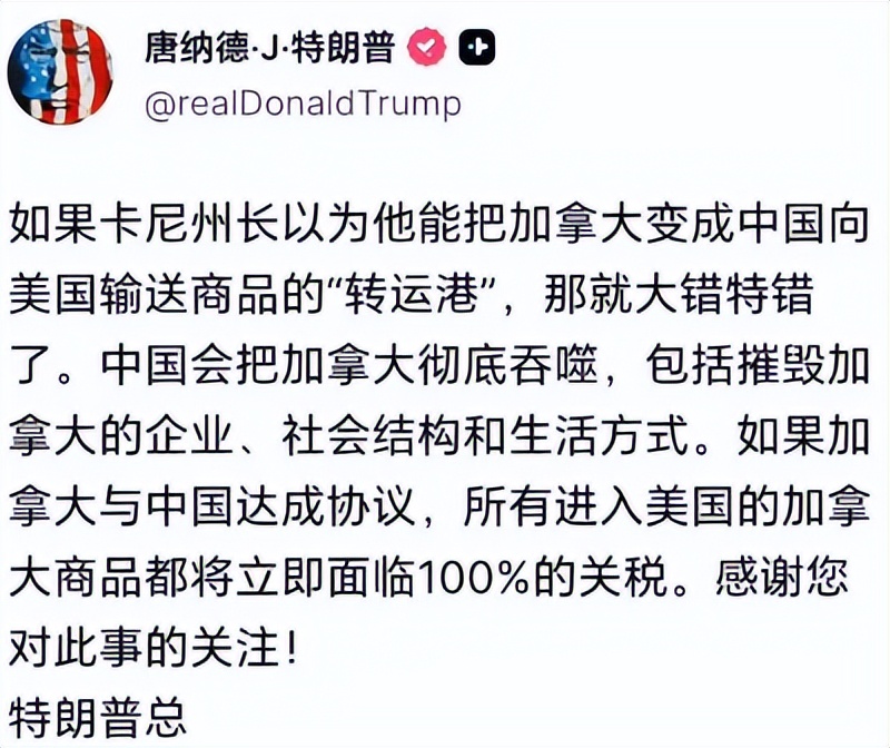 让加拿大民众非常不满的是,特朗普的文章中再一次称加拿大是美国的“第51个州”,全然不顾加拿大作为主权国家的基本尊严,喊话“卡尼州长”别想让加拿大成为中国转口贸易的地区。他还使用之前“侮辱性”的语言抹黑中加合作,表示要是自己不管不问,加拿大“会被中国彻底吞噬,摧毁当地的企业、社会结构以及整体的生活方式。