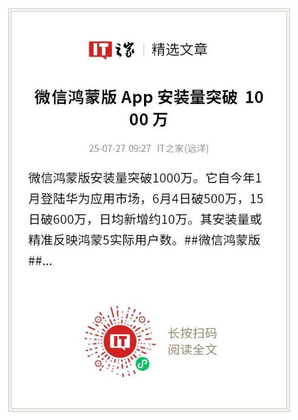 移动操作系统的竞争日益激烈,而鸿蒙生态却以惊人的速度崛起。近日,鸿蒙操作系统5终端设备数量突破1000万台,鸿蒙微信安装量也紧随其后突破1000万,这一系列数据无疑为鸿蒙生态的发展注入了强大动力。