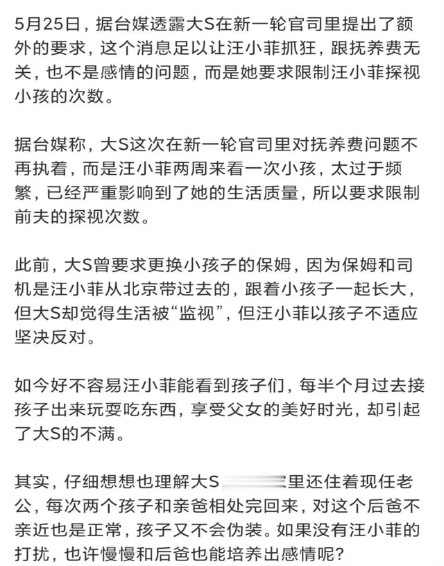 根据台媒报道,大S这次在新一轮官司里对抚养费问题不再执着,而是汪小菲两周来看一次小孩,太过于频繁,已经严重影响到了她的生活质量,所以要求限制前夫的探视次数。
