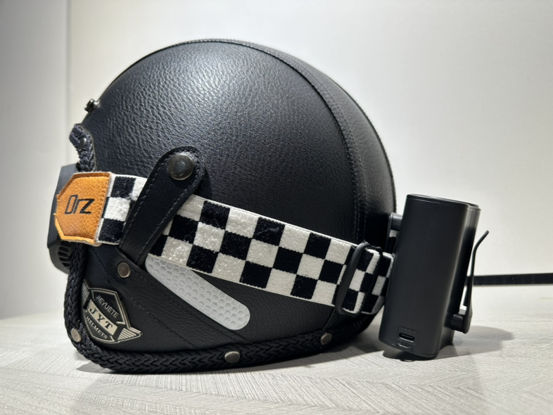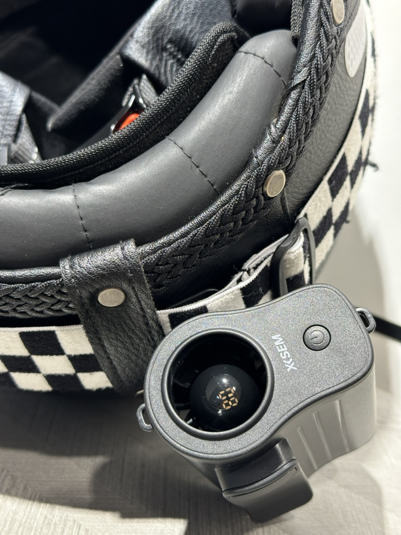 还有一种方式,是安装在头盔上,也是朝下安装模式,这种方式比较适合带四分之三或者半盔的朋友,吹的脖子以下都凉爽,转动头部的的时候还能吹肩膀。