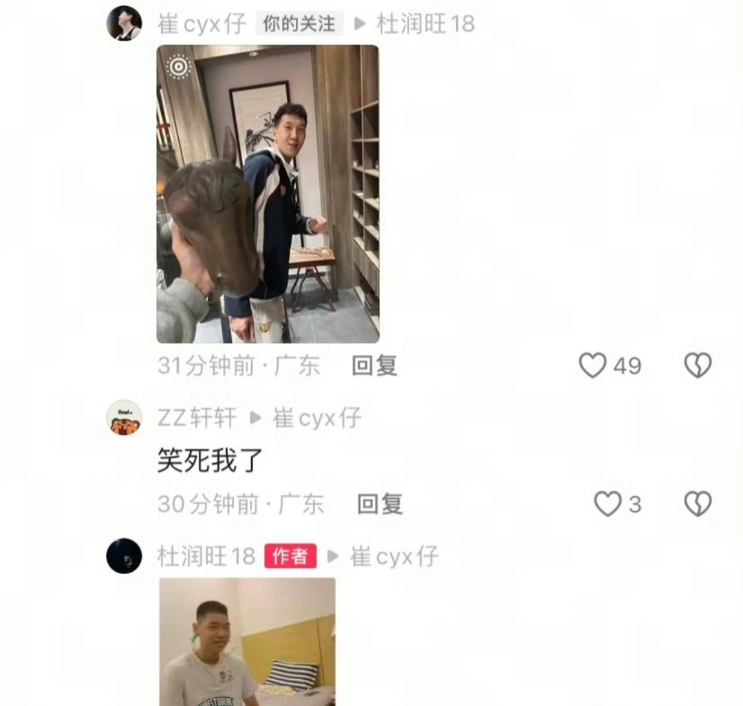 小崔直接在评论区回复了一个杜润旺和驴头的合影,大家都知道杜润旺因为脸长,被队友和球迷调侃为驴哥。崔永熙直接贴脸开大,把杜润旺和驴头的合影都放出来了。杜润旺也没饶了他,发了一张小崔大肚便便的照片,广东男篮队友们也是相爱相杀,不过有一点值得关注,那就是崔永熙加盟之后,广东男篮的队员们比以前要搞笑了,小崔的性格还是非常好的。