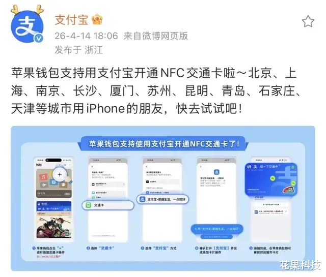 最近支付宝宣布:苹果钱包支持用支付宝开通 NFC 交通卡了!