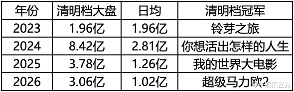 今年清明档整体表现相对一般,最终还是成功锁定了3亿大关,这意味着单日能够维持在1亿+的量级,很显然较往年比有着明显的差距。在市场严重下行的阶段,如此的表现其实已经基本符合市场预期了。