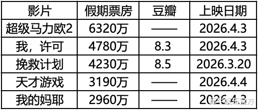不单单是票房表现乏力,目前清明档一众新片当中,仅有《我,许可》豆瓣开分了,目前影片拿到了8.3的高分,这种品质的加成也兑现了它在市场上的位置。其他方面,《超级马力欧2》、《天才游戏》、《我的妈耶》、《蝴蝶楼惊魂》等一众新片在上映至少3天的情况下,目前豆瓣依然未能完成开分。