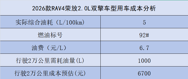 总的来说,2026款RAV4荣放2.0L双擎车型首年用车成本为6700元,保险费用为5749元,保养费用为1167元。总计该款车的首年用车、养车费用为13616元,平均每公里综合费用约0.68元。前三年随着用车年限的增加,保养成本基本会有所下降,如果不出险的情况下,保费也同样降低,4S店保养六万公里总费用为39242元,该车的三年平均每公里综合费用约0.65元。非4S店保养,六万公里总费用为37742元,平均每公里综合费用为0.63元。需要注意的是,以上费用没有包含停车费、过路费、洗车费等“零碎用车成本”。