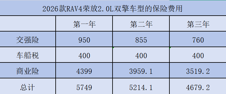 通过表格分析来看,2026款RAV4荣放的首年保费为5749元。连续两年不出险的情况下,费用会有所下调,第二年和第三年费用分别为5214元和4679元,前三年总计费用为15642元。