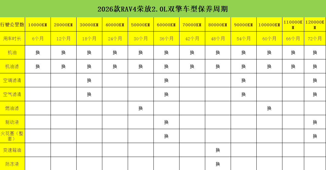 根据官方给出的保养手册来看,2026款RAV4荣放2.0L车型首保为10000公里,后续每10000公里保养一次。按照每年行驶2万公里里程来看,2026款RAV4荣放2.0L双擎车型前三年共行驶6万公里,其中5000公里免费全面检查(不换件)+10000公里首次更换机油机滤(免费首保),E-CVT变速箱终身免维护,无需更换变速箱油。相比普通燃油车,该款车还需增加三电系统专项检测,火花塞的更换周期可延长至10万公里。