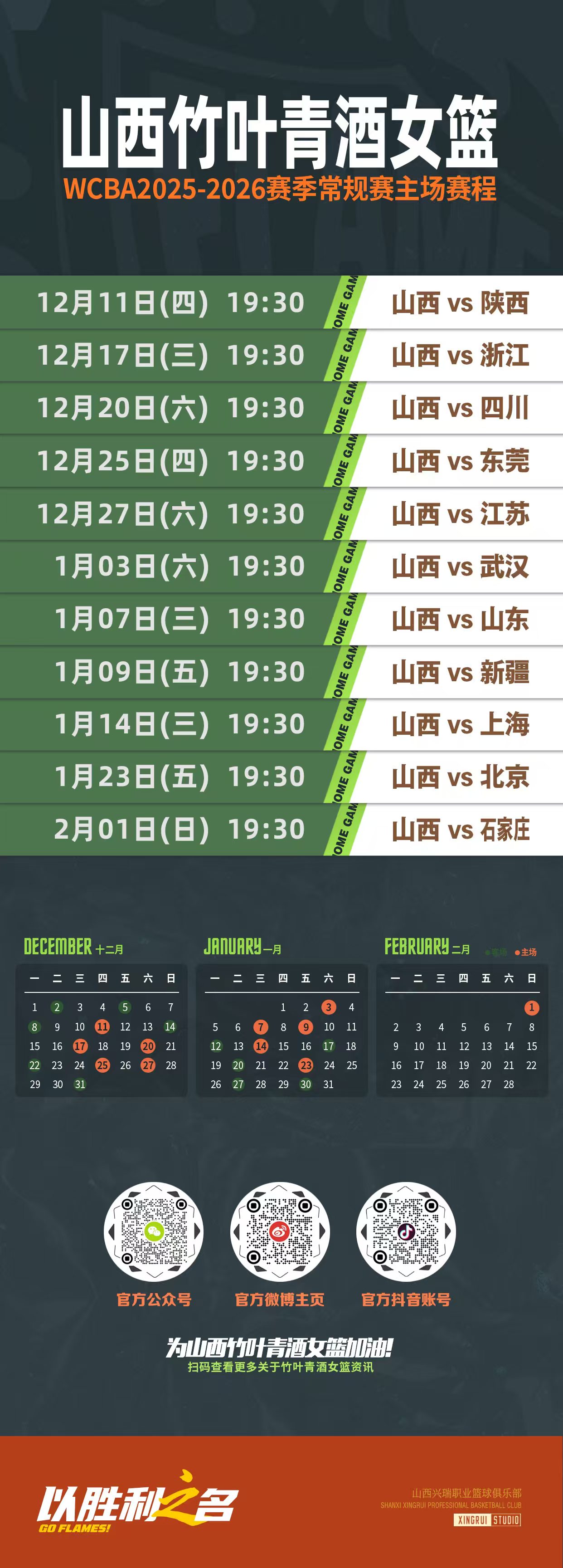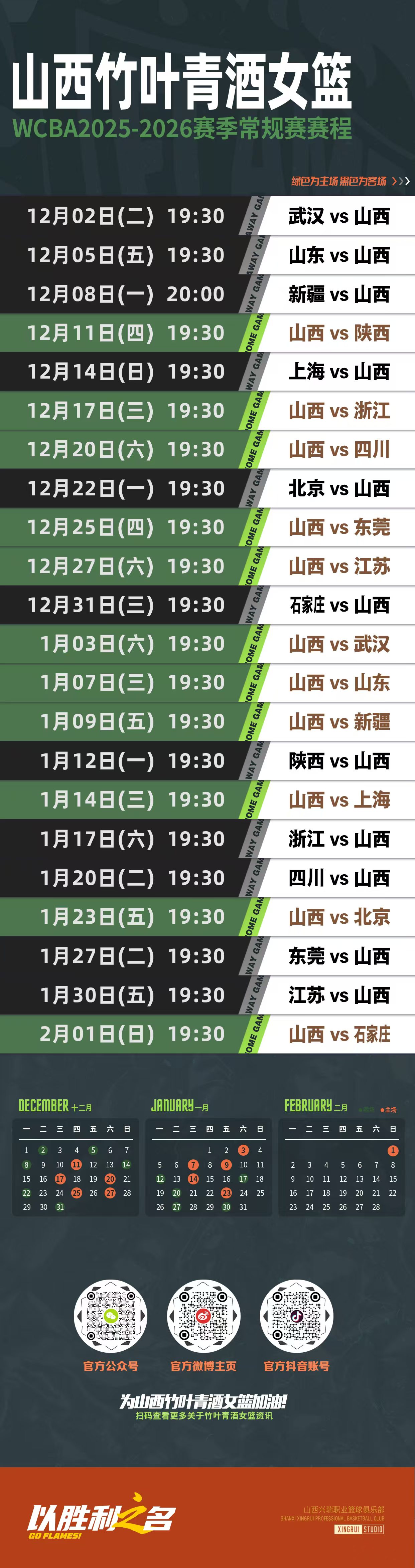 2025-2026赛季中国女子篮球联赛(WCBA)是由中国篮球协会主办的中国最高水平女子篮球赛事,于2025年12月至2026年2月进行常规赛阶段比赛。常规赛分为A、B两个组别进行。A组为上赛季前12名的队伍,其余球队分入B组。山西竹叶青酒女篮上赛季获得第四名,自动进入A组。 在常规赛阶段中,山西竹叶青酒女篮将与陕西队、浙江队、四川队等11支队伍进行主场比赛。