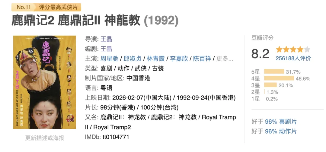 刚刚紧接着又空降了一部经典电影,那就是92年的电影《鹿鼎记2:神龙教》,该片30多年前,获得了3658万港元票房,是当年的年度票房第五名。