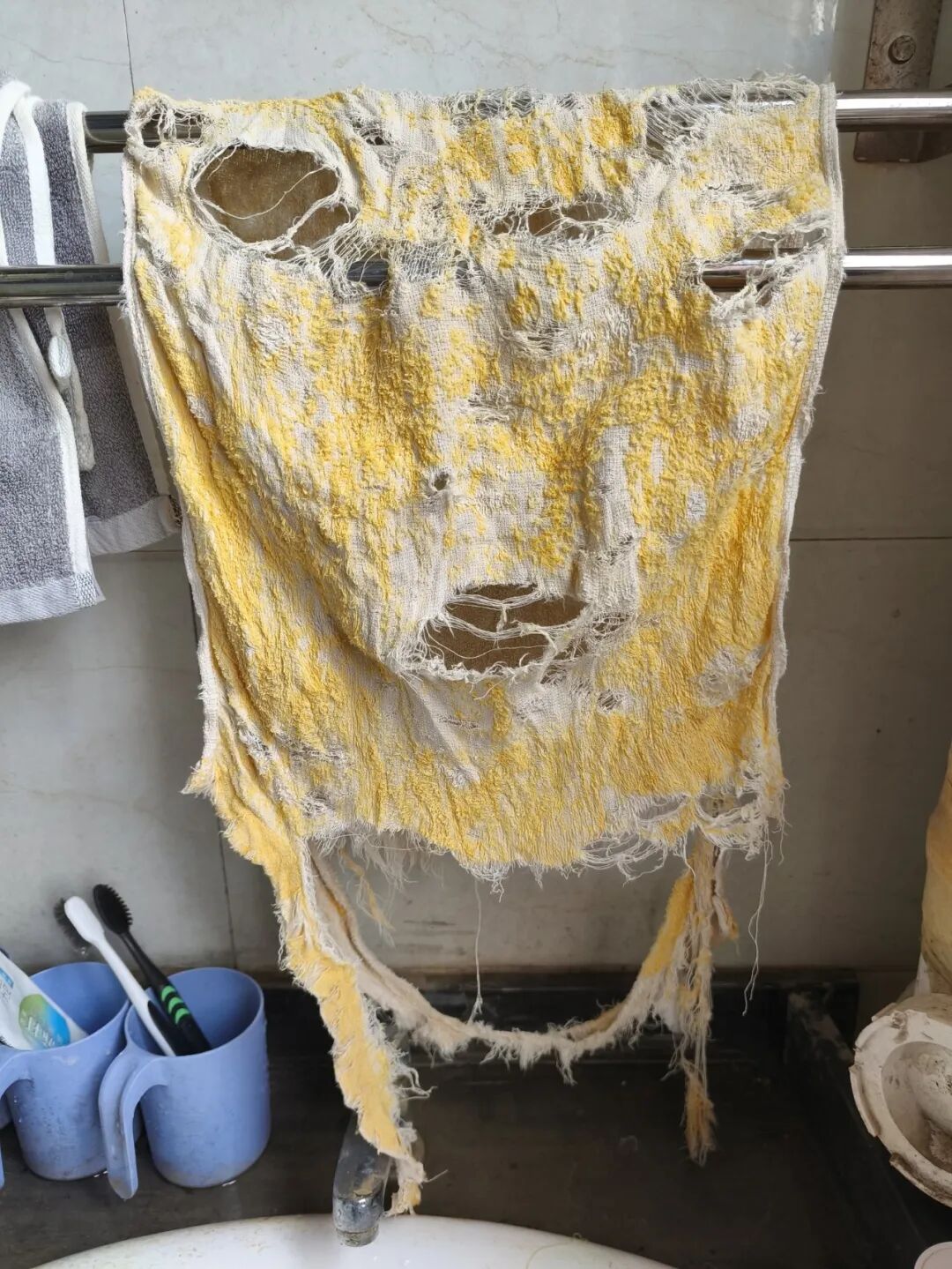 5.毛巾烂成这样了,还舍得不扔,而且每天用它擦遍全身。